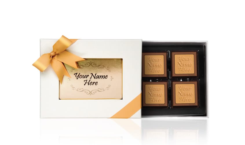 Twelve personalized chocolates in a refined gift box—crafted to elevate weddings, corporate events, or thoughtful celebrations with style and sweetness.