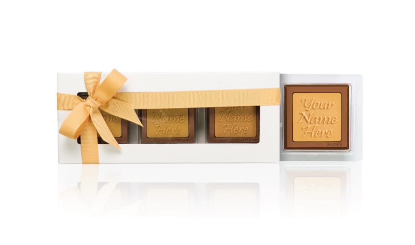 Three personalized chocolates, elegantly displayed in a transparent box. Ideal for minimalist gifting or event giveaways with a modern twist.