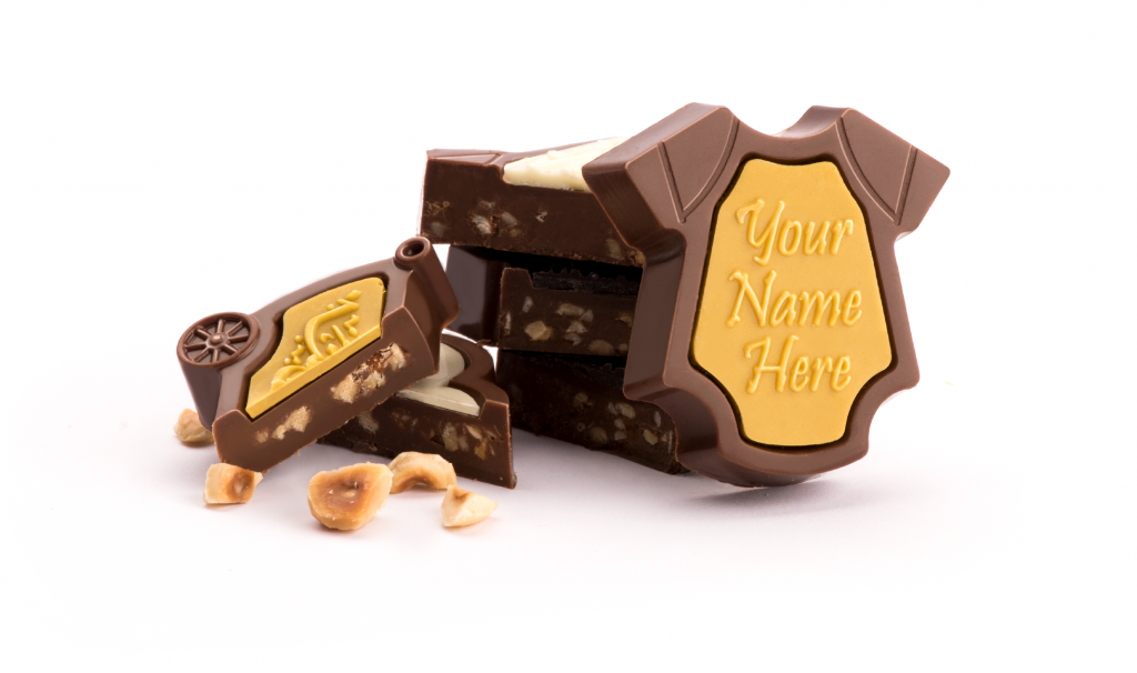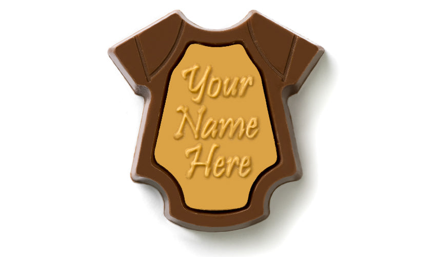A sweet welcome to a new baby. Personalized with the baby's name or a special message, this chocolate in the shape of a baby dress makes a perfect gift for baby showers, hospital visits, or to announce the happy news.