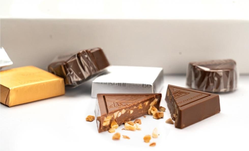 A premium 40g box, filled with a refined selection including biscuit, nuts, nuts with caramel, cornflakes, and caramel. Presented in an elegant white design with golden accents, ideal for gifting or sharing.