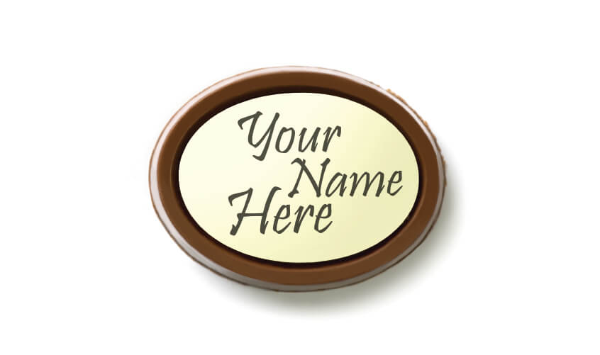 A round chocolate piece with an elegant design, featuring a personalized circle for printing your name, logo, or any phrase of your choice. Perfect for gifts, special occasions, or enhancing your brand identity in a delicious and memorable way.